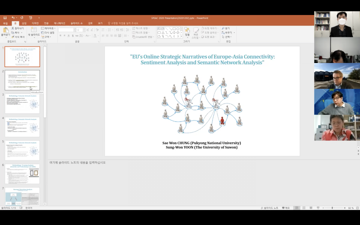 On December 2nd, Jean Monnet EU Centre had a two-day workshop for the SPEAC Network Project. Due to the pandemic, the seminar proceeded online. The first two sessions were held on the first day, and the rest continued the next day. Renowned EU scholars from Sweden, Poland, Singapore, and Germany participated and shared their views on the 'EU-Asia Connectivity.' The researchers presented their draft papers and exchanged constructive feedback. Links are below: